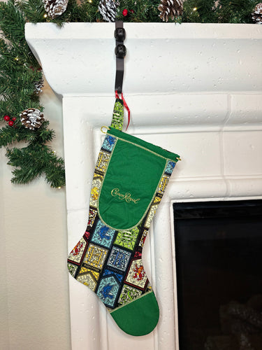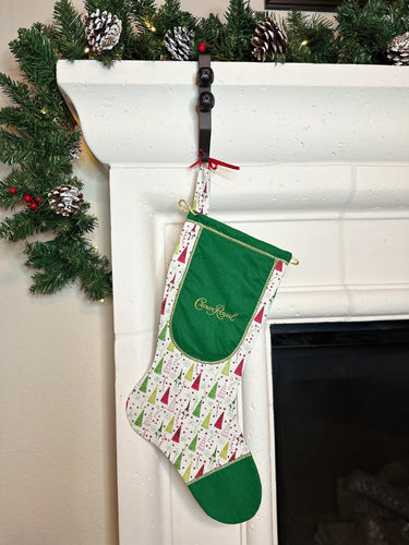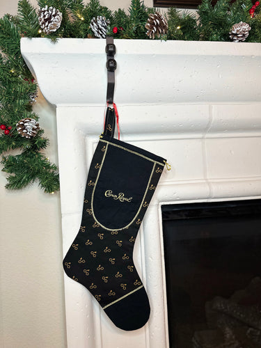 Christmas Cockpit Crown stockings are made from upcycled Crown Royal bags and new materials. In addition to the main stocking compartment, the Crown bag functions as an extra hiding spot for a special little gift.