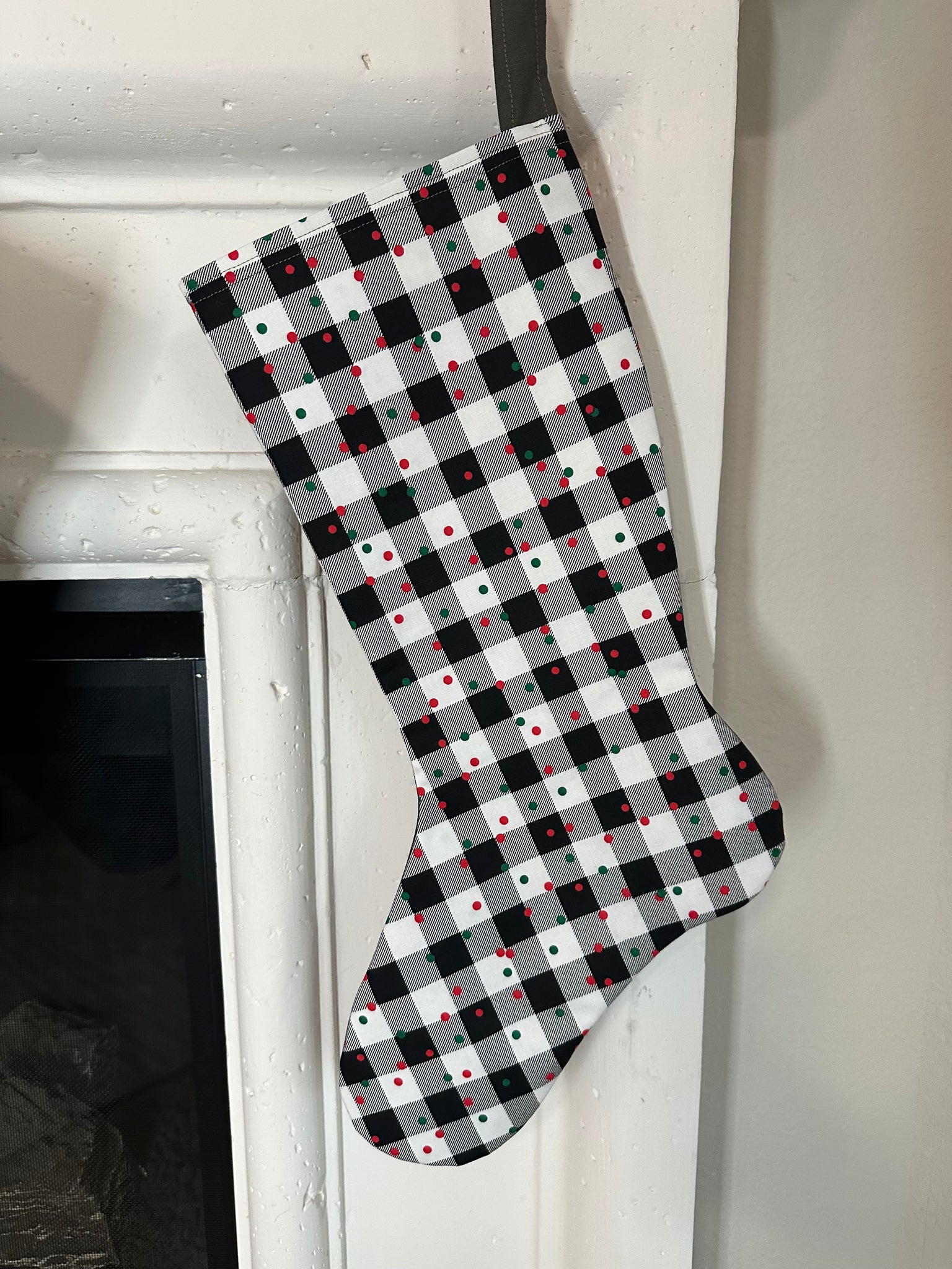 The "Ace of Aces: Buffalo dots" collection has a black and white plaid with red and green dots print fabric on the back.  Inside is a coordinating white fabric with red and green dots.